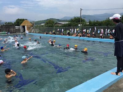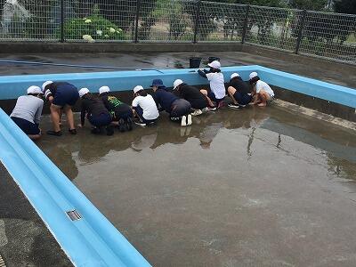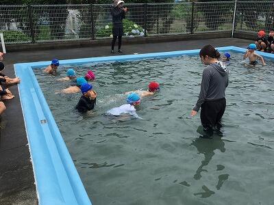 7月6日(水)台風4号が過ぎ去って、蒸し暑さを感じる1日です。4校時、今日は1年生がプールでがんばっている姿を見ることができました。ずいぶんと水にも慣れて、動物のまねをした歩き方でプール内を気持ちよさそうに動き回っていました。