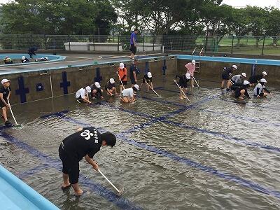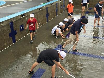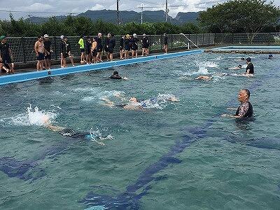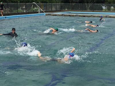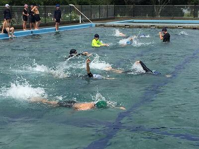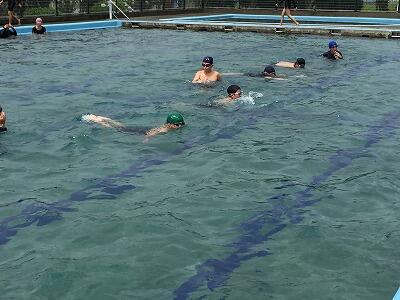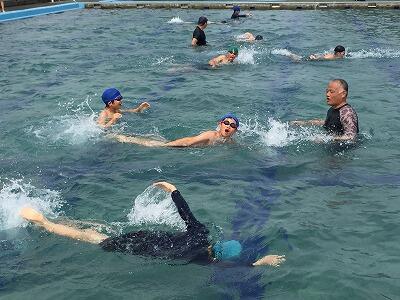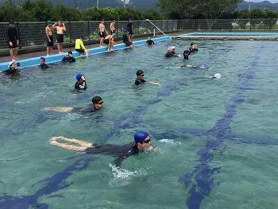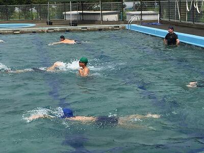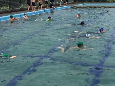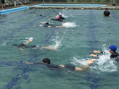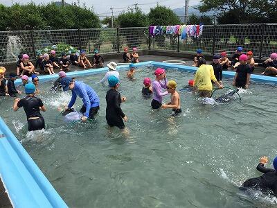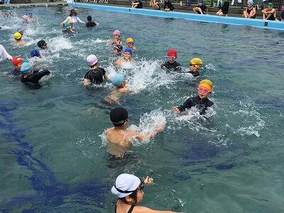 3年生は去年より一段階レベルアップして、今年から大プールで学習です。水慣れから少しずつ深さへの不安感も払拭されたようで、大プール中央でのクラス対抗「水かけ合戦」はとても盛り上がっていました。