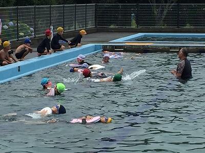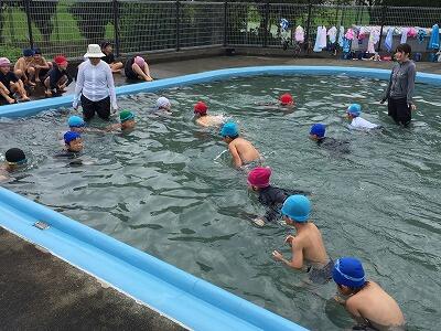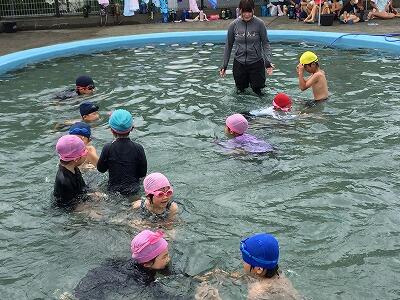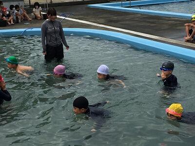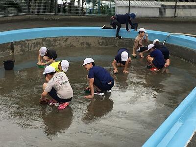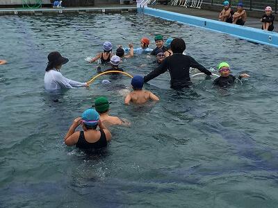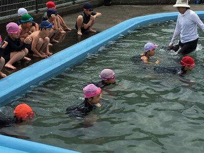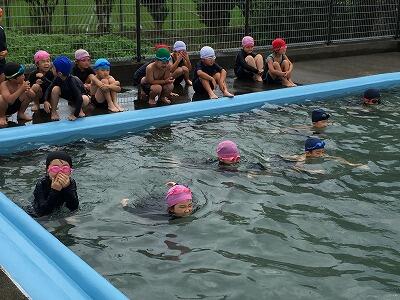 3年生は大プールで水の掛け合い合戦、輪っかくぐり抜け、水中じゃんけん、ビート板を使っての浮き方など、これまたいろんなことにチャレンジしながら、水の中での動きを楽しんでいました。