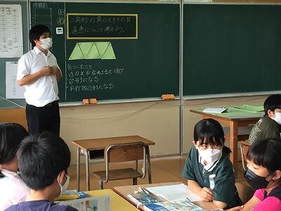 7月6日(水)3校時、5年2組で初期研修1年目の研究授業がありました。算数科「合同な図形」の単元で、三角形の3つの内角の和のきまりについて見付ける学習でした。三角形を敷き詰めて並べたり、分度器で測ったりしながら、どんな三角形も3つの内角の和は180°になることに気付きました。担任の指示や発問をよく聞いて一生懸命に取り組んでいる様子が見られました。