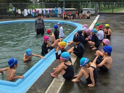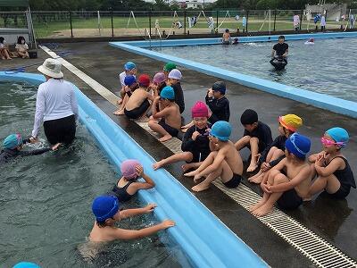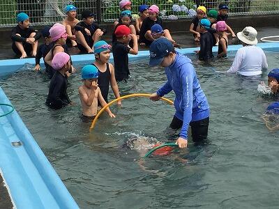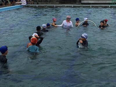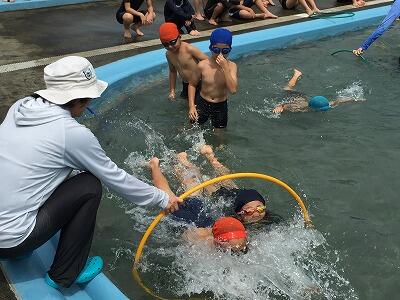 7月8日(金)3校時は2年生と3年生がプールで学習しました。2年生は小プールで、先生がもつフラフープの輪っかをくぐりぬけることに挑戦していました。思い切りよく潜ってくぐり抜ける子、慎重に片足ずつくぐり抜ける子などなど、自分のできるペースでチャレンジしていました。
