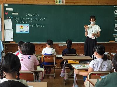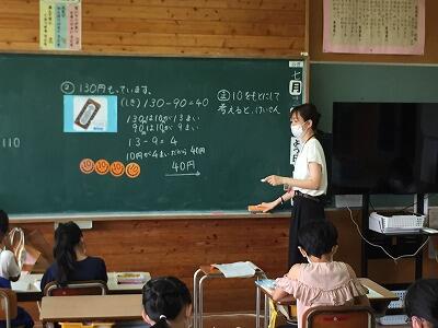 7月12日(火)2校時、2年3組で初期研修2年目と校内のテーマ研究の検証授業を兼ねた研究授業を実施しました。算数科「100をこえる数」の単元で、今日は80+30や130-90といった計算の仕方を考えました。10円玉の模型を操作しながら考え、10をもとにして考えると1年生の頃に学習した計算でできることに気付きました。授業後半には、いろんな計算にチャレンジしました。