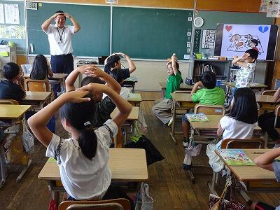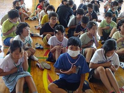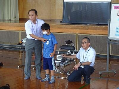 7月25日(火)19:00から第1回学校保健委員会を開催しました。今回は延岡市消防署、消防団よりお2人を講師としてお招きして「救命法研修」を行いました。心臓マッサージ、人工呼吸の仕方、AEDの使い方について実技をとおして丁寧に教えていただきました。また、日常生活の中でのいろいろな緊急事態への対応の仕方についても知ることができました。日が暮れても体育館はまだまだ暑かったのですが、20名程の保護者の皆様、そして子どもたちに熱心に取り組んでいただきました。参加してくださった皆様、本当にありがとうございました。