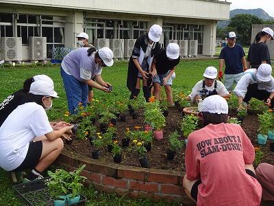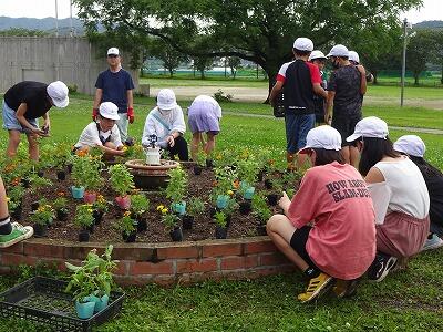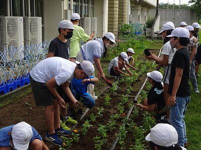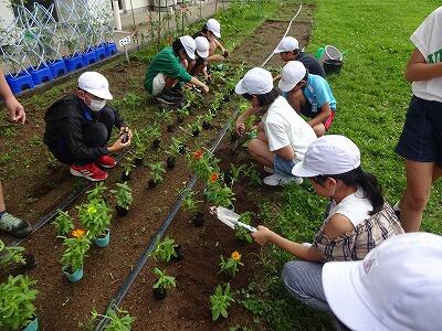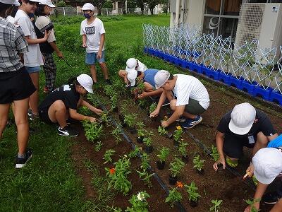 今週は「夏の花植え週間」でした。先月から雨の合間を見て、草取りを続けてきた各学年学級の花壇。7月に入って、学校技術員さんの指導協力で、子どもたちが雨の降らない時間帯に花の苗を植えました。写真は6年生の様子です。学校全体がまた一段と明るくなったように感じます。