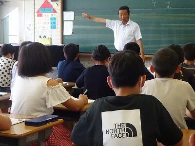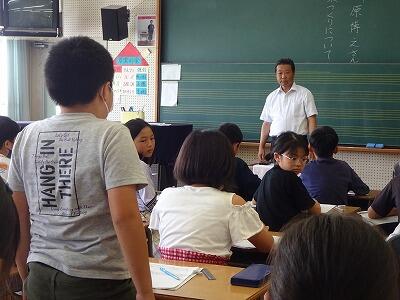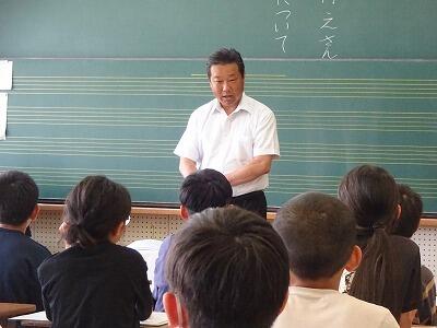 7月11日(火)4校時、5年生は「子どもたちに伝えたいこと」で、本校の「米作り活動」に関わってくださっている川原博之さんをお迎えしてお話をお聞きしました。本校では6月28日に田植えをしたのですが、田植え前から稲刈り後の米作りの一連の作業や苦労について、エピソードを交えながらわかりやすく教えてくださいました。後半は、子どもたちのさまざまな角度からの質問にも丁寧に答えてくださいました。このお話を聞いて、5年生は米作りやお米そのものについての関心がさらに深まったことと思います。川原さん、ありがとうございました。