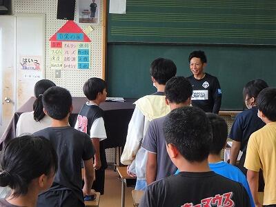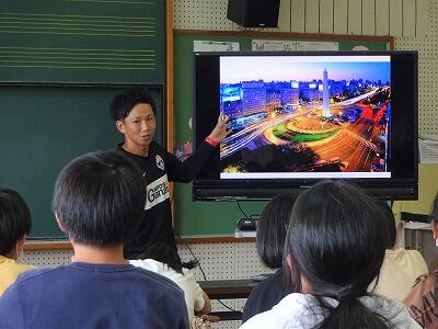 7月12日(水)3校時、延岡市キャリア教育支援センターのご協力で6年生の「よのなか教室」を開催しました。講師はNPO法人Ganar代表理事:富高和幸さんです。富高さんはサッカーのプロを目指すために単身アルゼンチンに渡られた経験をもとに、「世界」基準でご自身が感じたこと、考えたことをエピソードを交えてお話しくださいました。「見て感じて自分で考える」「無理か無理じゃないかは自分で決める」「チャンスをつかめるかは自分の準備しだい」などなど、子どもたちの胸に刺さる言葉を伝えてくださいました。子どもたちが前のめりになって聞いている姿も印象的でした。富高さん、ありがとうございました。