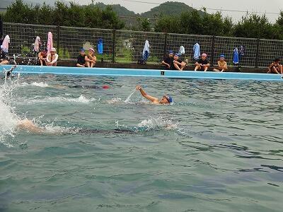 6月27日(火)いい天気です。4・5校時、4年生がプールびらきをしました。朝からの日差しでプールサイドのセメント部分の温度も上がっていて暑さを感じるのですが、シャワーはやっぱり冷たいみたいでした。1組、2組交代でプールに入り、少しずつ水慣れをしながら、もぐったりジャンプしたり、手で掻きながら走ったりといろいろな動きに挑戦していました。
