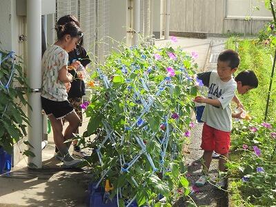 毎朝8時前に、1・2年生は自分たちが栽培しているアサガオやミニトマト、そして学級園の野菜に忘れずに「水やり」をしています。前日、雨が降っていたとしても、律儀に水やりをする1・2年生の姿はとてもほほえましいです。そのやさしい気持ちがきっと植物にも伝わるのだと思います。明日からもがんばって1・2年生!