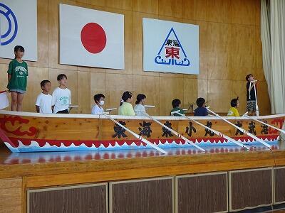 本年度は8月20日(日)に延岡市郷土芸能大会が行われる予定です。4年生は発表に向けて、今日も暑い中、練習を続けています。7月24日(月)今日は、その発表の際に使用する伝馬船をきれいにするために、本校の学校運営協議会委員でもあるリバーパル五ヶ瀬川の館長さんとお手伝いの方が来校してくださいました。しばらくの間、使用していなかったので作業が大変だったと思います。暑い中、子どもたちのために本当にありがとうございます。