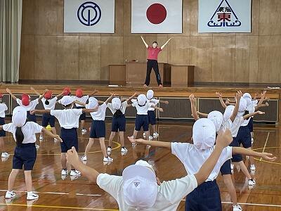 9月16日(金)今日は3校時に2年生の体育を見に行きました。2年生も表現(ダンス)の練習をしていました。指導する先生の元気いっぱいの声に応えて、子どもたちも体いっぱいを使って踊っていました。隊形の変化や時間差の動きなどもあって難しそうですが、2年生はこの時点でバッチリ覚えているようです。さすがです。にこにこしながら楽しそうに踊っている姿が印象的でした。