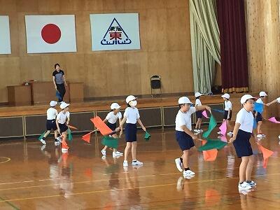 9月20日(火)5校時、今日は4年生の体育の様子を見に行きました。体育館で表現(ダンス)に取り組んでいた4年生、きれいな色のフラッグを両手に持ち、気持ちのよい音を響かせながら踊っていました。テンポの速いリズムにのって大きくフラッグを振りながら、時折、元気なかけ声も入って迫力を感じました。これまた、完成が楽しみです。
