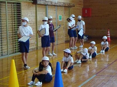 5月23日(火)振替休業日明けの3校時、体育館で1年生の体力テストを6年生がサポートしていました。この時間、1年1組がチャレンジしたのは「上体起こし」と「反復横跳び」です。がんばる1年生の記録をカウントしてカードに記録するのが6年1組の役目です。時折、励ましの声かけもしながら、やさしくサポートしていました。あさって25日には1年2組のサポートを6年2組が担当してくれる予定です。