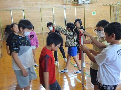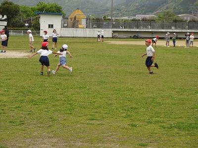 4月19日(水)4校時、体育の時間に2年生と3年生が運動場で一緒に体を動かしました。もともとは3月に交流活動(その時は1年生と2年生)をする予定でしたが天気の関係で実施できなかったので、今回改めて計画したとのことです。運動場の周囲にイラスト付きの段ボールが置かれ、それを2年生が倒すために走り回ります。3年生は倒されないように2年生にタッチ、タッチされた2年生はマーカーの置かれた場所で仲間の助けを待ちます。制限時間5分内に1個でも段ボールを倒したら2年生の勝ち、倒されないように守り切ったら3年生の勝ちというルール。真剣な表情で、元気いっぱい走り回った2・3年生でした。