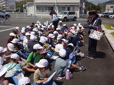 5月16日(火)3・4校時、1年生は生活科の「がっこうのまわりをあるいてみよう」の学習で校外に出かけました。南門を出て西に進み、アタックスの交差点で右折し、ローソン前の細い道に入って学校まで戻りました。その間に「カーブミラー」や「歩道橋」など学校の行き帰りの安全のために大事なポイントについて、先生といっしょに確認することができました。