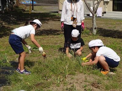 5月2日(火)3年生は、2年生の時の生活科の時間に苗を植えて世話をしてきたタマネギの収穫をしました。交代交代で畑に入り、自分がこれだと思ったものを土の中からひっぱり出すと、思ったよりも大きかったり、小さかったり・・・。みんな楽しそうでした。畑の周りにタマネギの新鮮なかおりが漂っていました。