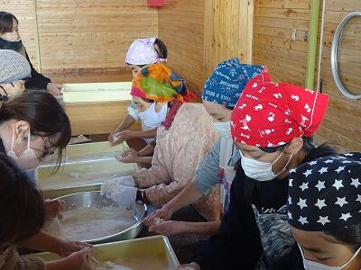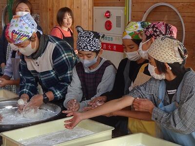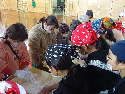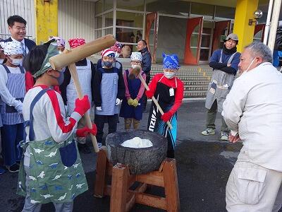 12月1日(金)本日は参観日です。5年生は「もちつき」体験に取り組みました。朝早くから、保護者の方、田植え・稲刈りの時にもご協力いただいたJAの方、地域の方にたくさん来ていただきました。大人のお手本を見て、まずはきねをつかってのもちつきに挑戦。2人で息を合わせてテンポよくつくことの難しさ、大変さを子どもたちは実感したことと思います。次はつき上がったもちを丸める作業、熱いもちをちょうどよい大きさにちぎるのは、地域の年配の方にもご協力をお願いしました。さすがでした。保護者の方のご指導で、白くて丸いおもちが次々にもろぶたの上に並んでいきました。ご協力いただいた皆様、本当にありがとうございました。