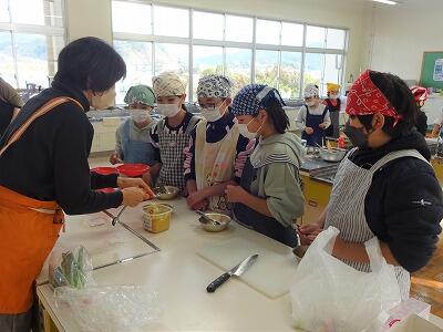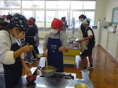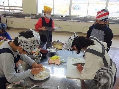 12月20日(水)1~3校時、5年2組が調理実習に取り組みました。「ごはんとみそしる」づくりに挑戦です。具材の切り方、だしやみその加減、ごはんを炊く時の火の強さの調整など、先生方のアドバイスをもとにグループで協力して取り組んでいる様子が見られました。試食もさせてもらいましたが、とてもおいしかったです。昨日の1組のもおいしくできていました。ぜひ、家でもおうちの人と一緒に挑戦してみるといいですね。5年生、ごちそうさまでした。