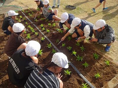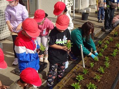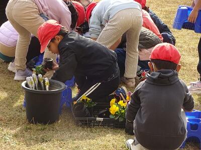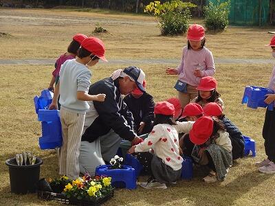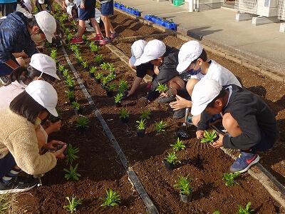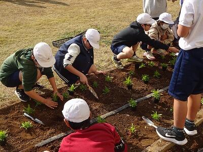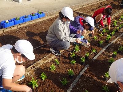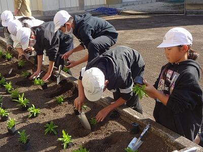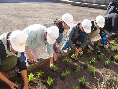 12月に入って、全学年の子どもたちが時間を分けて、学校園・学級園・一人一人のポットに春に向けての花を植えています。技術員さんに教えてもらいながら、やさしく丁寧に花の苗を植えている様子が見られました。下の写真は5年生、1年生、4年生が植えているところです。