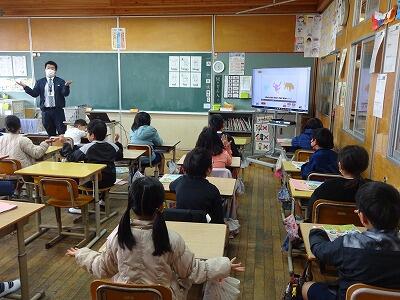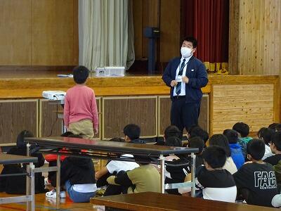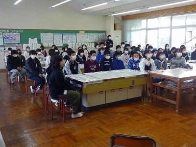 1月25日(木)3校時に5年生は、本校の学校運営協議会委員でもあるリバーパル五ヶ瀬川館長:山田大志さんをお招きし、「防災減災講話」をしていただきました。これは今5年生が総合的な学習の時間で取り組んでいる「地域の防災安全マップを作ろう」の学習の一コマで、特に地震・津波の災害について資料や実験をとおしてくわしく教えていただきました。1月1日に起きた能登半島地震の被害には、子どもたちも大きな衝撃を受けていると思います。この学習での学びを自分自身、友達そして家族を守ることに生かせるように、今後も真剣に取り組んでほしいと思います。