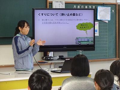 1月26日(金)2~4校時、宮崎交通さんによる「バスの乗り方教室」に4年生が参加しました。まずは2台のバスが学校に到着。そのうち1台はポケモン:ナッシーのラッピングバスで、子どもたちはうれしそうに見ていました。路線バスの仕組みや設備、乗り方等について説明を聞いた後、実際に整理券を取りながら2台のバスに乗り込み、宮交バスの整備工場、延岡市清掃工場の見学に出かけていきました。