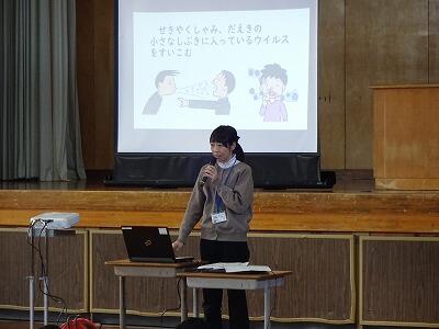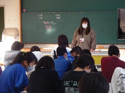 2月13日(火)3校時、延岡市キャリア教育支援センターのご協力で6年生「第3回よのなか教室」を開催しました。講師は県立延岡病院看護部:吉田希美さんです。吉田さんは"がん看護専門看護師”というお立場で、本日は「専門看護師の仕事について」「がんという病気について」「実際の患者さんへの関わり」についてわかりやすくお話ししてくださいました。その後、ご自分のお仕事の経験をとおして6年生へメッセージを送ってくださいました。「さまざまな経験をしよう、世界を知ろう」など心に残る言葉を伝えてくださいました。また、さまざまな質問にも丁寧に答えていただきました。吉田さん、ありがとうございました。
