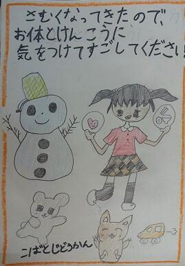 冬休みになりました。子どもたちは元気に楽しく過ごしていることと思います。12月25日(月)クリスマスです。こばと児童館で冬休みを過ごしているお友達が先生と一緒に学校にクリスマスカードを届けてくれました。心温まるメッセージとイラスト付きのカード、とてもうれしかったです。ありがとうございます。