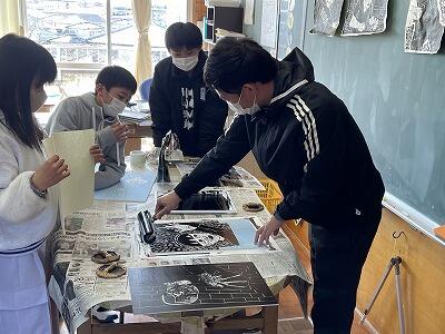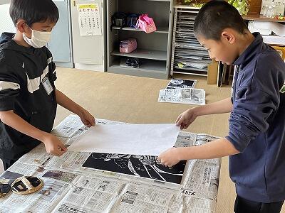 2月6日(火)3校時、5の1と6の1が図工でそれぞれ木版画の制作に取り組んでいました。まだ一生懸命に彫っている子どもたちもいましたが、最終段階の刷りに入っている子どもたちもいました。ローラーで黒インクを版にすり込ませて、慎重に紙をおいて、ばれんで紙に版を写し出します。どちらのクラスもいい作品が完成していました。