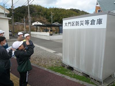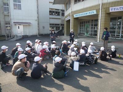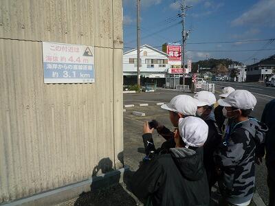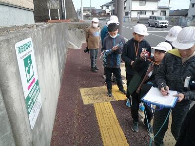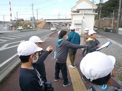2月7日(水)3~5校時、5年生は総合的な学習の時間で取り組んでいる「防災マップづくり」のためのフィールドワークに出かけました。自分たちが住んでいる地区ごとにグループを作り、それぞれ分かれて移動し、避難場所や危険箇所など事前の学習で確認した視点にもとづいて、写真を撮ったりメモに記録したりしました。実際に自分たち自身で歩きながら見ることで、防災への意識が一段と高まったのではないかと思います。写真は、大門地区周辺を回った子どもたちの様子です。