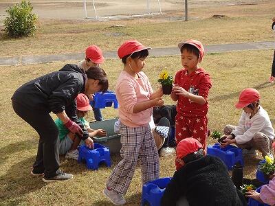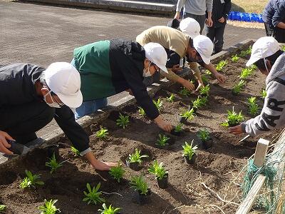 12月に入って、全学年の子どもたちが時間を分けて、学校園・学級園・一人一人のポットに春に向けての花を植えています。技術員さんに教えてもらいながら、やさしく丁寧に花の苗を植えている様子が見られました。下の写真は5年生、1年生、4年生が植えているところです。