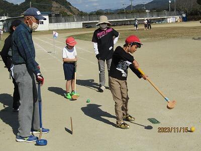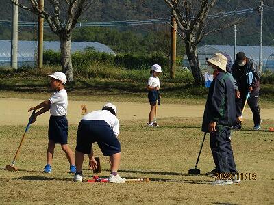 11月15日(水)に3年生が地域の方々とのグランドゴルフに挑戦しました。東海東地区社会福祉協議会の会員42名の方に来校していただき、2校時には3年1組、3校時には3年2組の児童と一緒にグランドゴルフを楽しんでいただきました。それぞれグループに分かれて、ルールや打ち方を教わりながら地域の方と楽しく交流することができました。各ホールから楽しそうな笑い声が聞こえていました。ご参加いただいた地域の皆様、ありがとうございました。