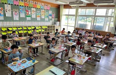 さて、今日は1年生にとって初めての給食でした。献立は「牛乳、コッペパン、スパゲティナポリタン、チーズサラダ」です。1組も2組も、おいしそうに食べている様子が見られました。