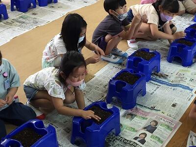 5月12日(木)今日も朝から雨がずっと降っています。3校時、1年生は生活科の時間にアサガオの種まきをしました。あいにくの雨なので、教室横のオープンスペースと生活科室に新聞紙を広げて、1組・2組いっしょに活動しました。土を入れて、肥料を入れて、指で土に穴を開けて、種を入れて・・・・。先生の説明を聞きながら、みんな上手に作業を進めていました。芽が出てくるのを楽しみに待ちたいと思います。