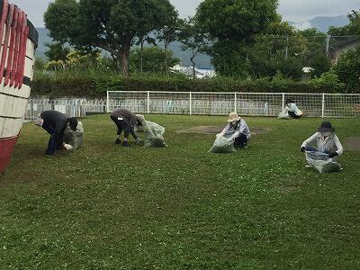 暑い中、運動場ではPTA施設厚生部長さんが草刈り作業をしてくださっていました。子どもたちのために、本当にありがとうございます。