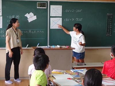 7月4日(火)3校時、5年2組で1年目の先生の研究授業がありました。算数科「合同な図形」の単元で、四角形の4つの内角の和について考える学習でした。子どもたちはグループで話し合いながら、三角計の内角の和180°をもとにしっかりと自分たちの考えを説明することができていました。