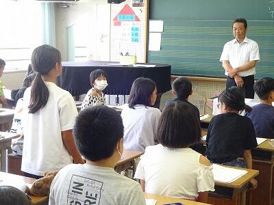 7月11日(火)4校時、5年生は「子どもたちに伝えたいこと」で、本校の「米作り活動」に関わってくださっている川原博之さんをお迎えしてお話をお聞きしました。本校では6月28日に田植えをしたのですが、田植え前から稲刈り後の米作りの一連の作業や苦労について、エピソードを交えながらわかりやすく教えてくださいました。後半は、子どもたちのさまざまな角度からの質問にも丁寧に答えてくださいました。このお話を聞いて、5年生は米作りやお米そのものについての関心がさらに深まったことと思います。川原さん、ありがとうございました。