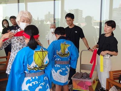 6月19日(月)4校時、4年生は「櫂伝馬踊り」の現時点でのできばえを保存会の方に見ていただきました。「一番大切な元気のよい大きな声が出ていますね」とおほめの言葉をいただきました。口上の速さや各パートの動きについてもアドバイスをいただきました。今日のご指導をもとに、4年生のがんばりでよりよいものに仕上げていってくれると思います。