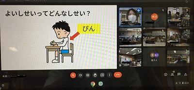 これまで感染予防対策として全校放送で全校朝会を行ってきましたが、今回はGoogle Meetを使って各教室をオンラインでつなぎ、モニターで各教室の様子も見合うことができました。校長、養護教諭もスライドを使いながら話すことができ、オンラインのよさを生かしながらの朝会となりました。