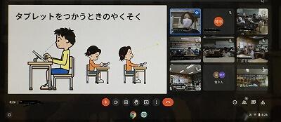 これまで感染予防対策として全校放送で全校朝会を行ってきましたが、今回はGoogle Meetを使って各教室をオンラインでつなぎ、モニターで各教室の様子も見合うことができました。校長、養護教諭もスライドを使いながら話すことができ、オンラインのよさを生かしながらの朝会となりました。