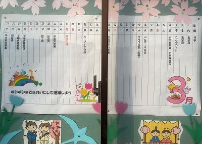 「メニュー」→「参観日予定・行事カレンダー」(携帯・スマホでご覧の方は記事の下にメニューがあります)よりご確認ください。
