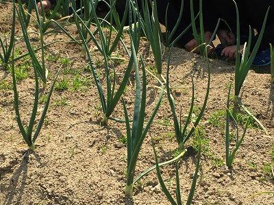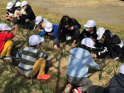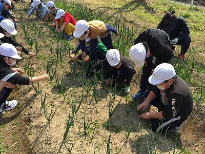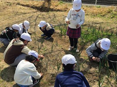 3月2日(水)4校時、2年生が玉ねぎ畑で草取りをしていました。以前も紹介しましたが、この玉ねぎは苗を植えてすぐに、張っていたマルチがはがれるほどの強風に見舞われて植え直しをしたものですが、寒い冬を乗り越えて大きくなりました。2年生のこれまでのお世話のたまものでしょう。今後の成長が楽しみです。
