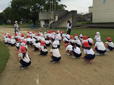 雨が降りそうで降らない天気のタイミングを利用して、3校時に2年生は運動場で体育をしていました。みんな元気に徒競走のコースを駆け抜けていました。
