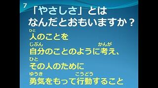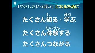 朝の時間は5月の全校朝会を放送で行いました。初めに今日から東海東小に仲間入りした1年生の転入生を紹介しました。放送での自己紹介でしたが、上手にできました。その後、校長から東海東小の"合い言葉"である「やさしさいっぱい」について話をしました。校内放送でしたので、各学級で下のような画面をモニターに映し出し、児童はそれを見ながら話を聞きました。