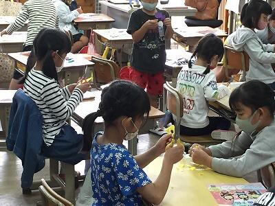 1年生は図工で、はさみを上手に使って折り紙に切り込みを入れて、きれいな飾りを作っていました。