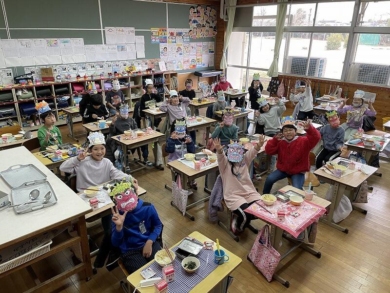 給食時間に2年3組をのぞいてみると、手作りのおにのお面をかぶってポーズをとってくれました。