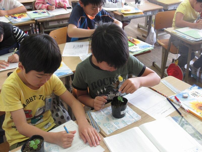 3年生の理科の学習では、マリーゴールドやホウセンカの種をまいて、その成長の様子を調べています。今週の理科では、出てきた芽を、虫眼鏡で見たり、手ざわりを確かめて、細かく観察しました。1粒の種から出てきた芽を見て、驚きの声もあがりました。生命のふしぎを感じた瞬間でした。