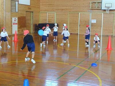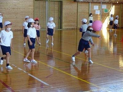 2校時、1年生は1・2組合同で体育館で「ドッジボール」に取り組んでいました。ソフトバレーボールを使ってのドッジボール、元気な声がどのコートからも聞こえていました。投げたり、キャッチしたり、逃げたりなど、みんな上手になっていました。