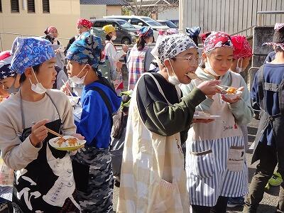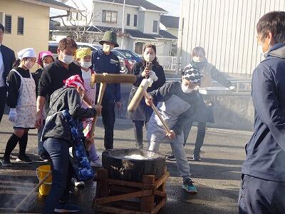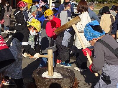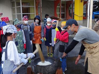 12月1日(金)本日は参観日です。5年生は「もちつき」体験に取り組みました。朝早くから、保護者の方、田植え・稲刈りの時にもご協力いただいたJAの方、地域の方にたくさん来ていただきました。大人のお手本を見て、まずはきねをつかってのもちつきに挑戦。2人で息を合わせてテンポよくつくことの難しさ、大変さを子どもたちは実感したことと思います。次はつき上がったもちを丸める作業、熱いもちをちょうどよい大きさにちぎるのは、地域の年配の方にもご協力をお願いしました。さすがでした。保護者の方のご指導で、白くて丸いおもちが次々にもろぶたの上に並んでいきました。ご協力いただいた皆様、本当にありがとうございました。