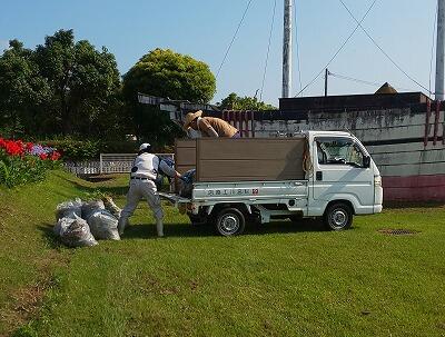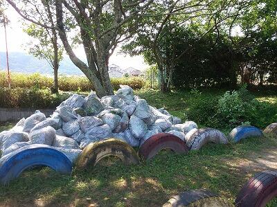 8時頃から、刈った草などをビニル袋に入れていく作業をしていただきました。東門付近の収集場所は、草等が入ったビニル袋や剪定した枝でいっぱいになりました。