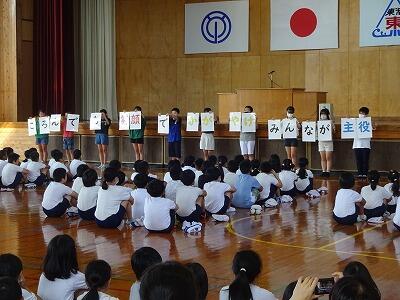 9月11日(月)朝の時間に、秋季大運動会の結団式を行いました。久しぶりに全校児童が体育館に集まり、まず体育主任から今年の運動会についての説明があり、校長から「学年を超えた仲間と心を一つにしてがんばること」「いつでも全力」について話をしました。そのあと、運営委員会が今年の運動会スローガンをわかりやすく伝えてくれました。