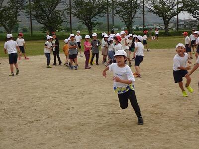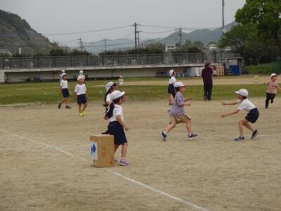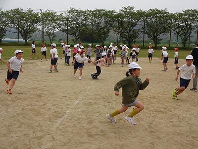 4月19日(水)4校時、体育の時間に2年生と3年生が運動場で一緒に体を動かしました。もともとは3月に交流活動(その時は1年生と2年生)をする予定でしたが天気の関係で実施できなかったので、今回改めて計画したとのことです。運動場の周囲にイラスト付きの段ボールが置かれ、それを2年生が倒すために走り回ります。3年生は倒されないように2年生にタッチ、タッチされた2年生はマーカーの置かれた場所で仲間の助けを待ちます。制限時間5分内に1個でも段ボールを倒したら2年生の勝ち、倒されないように守り切ったら3年生の勝ちというルール。真剣な表情で、元気いっぱい走り回った2・3年生でした。